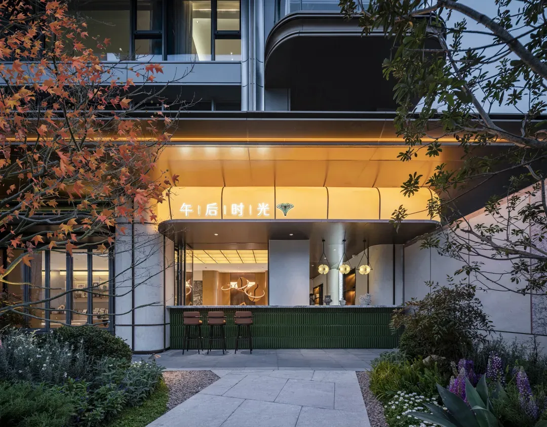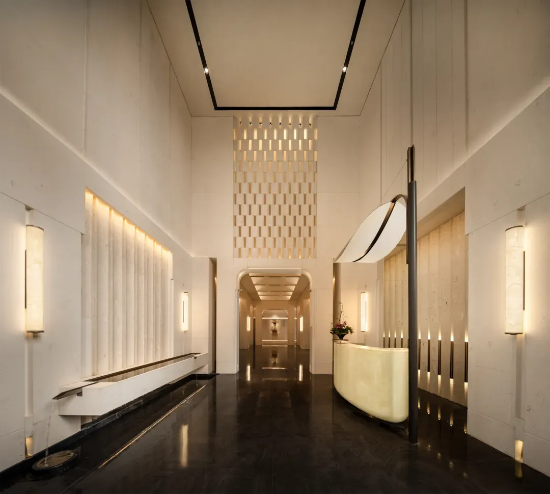 会所大堂约4米层高,墙面月光米黄大理石,地面墨染流云大理石,天花肌理漆,中央绿植装置与落地窗外园林呼应,地上地下大堂无规格区分,是对产品的极致用心