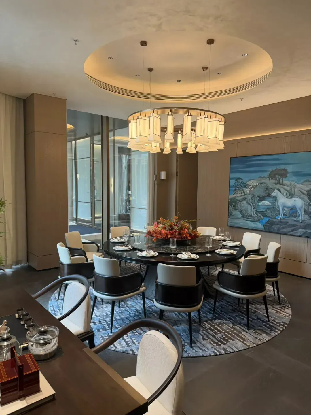 私宴厅,可容纳12人就餐,关键是配有独立卫生间、备餐间、棋牌室,搭配全景玻璃窗!直面庭院美景!据传这里未来将和高端酒店合作,不出小区就能享受高端私密的宴请体验,给亲朋好友亿点点震撼