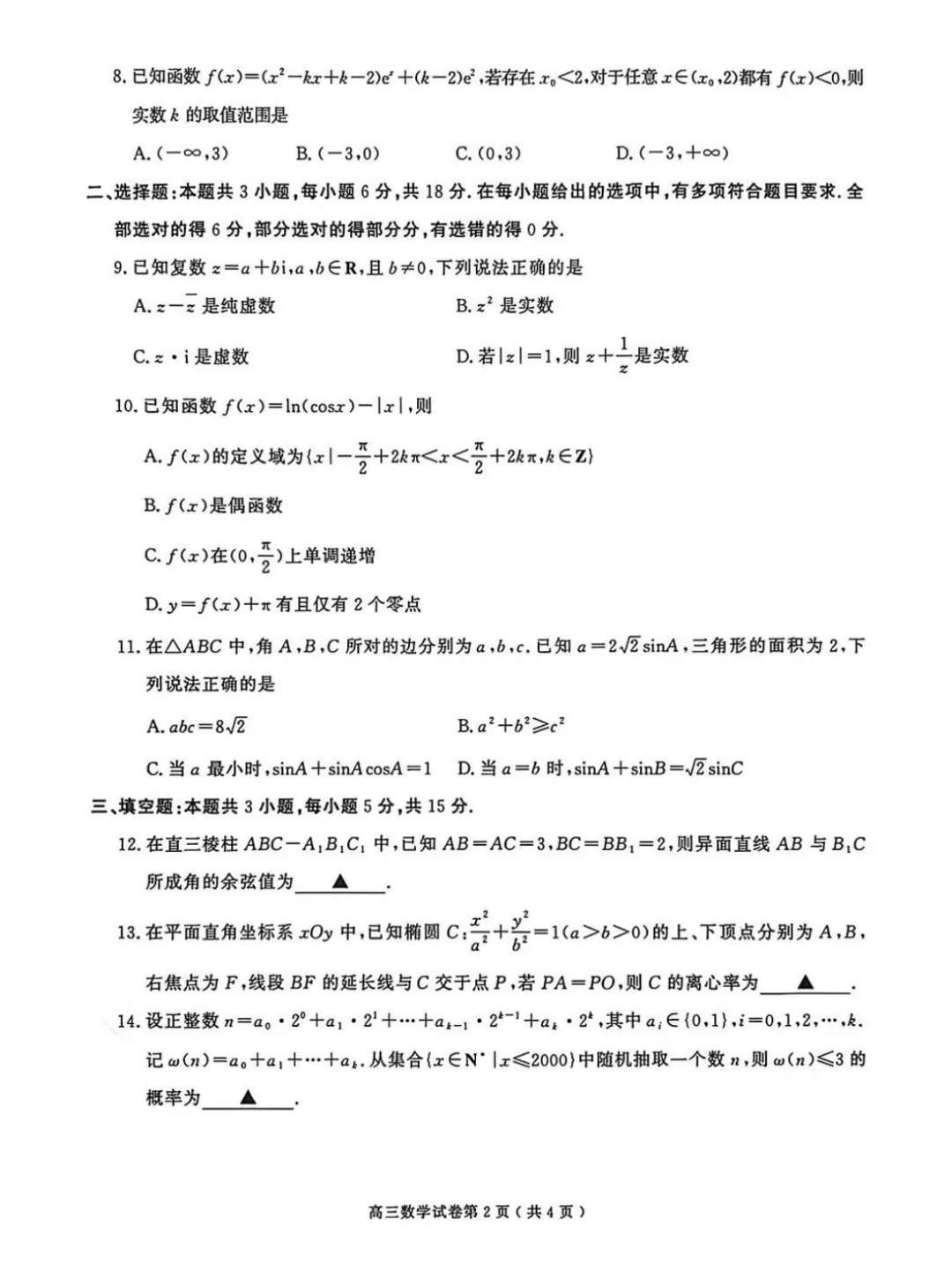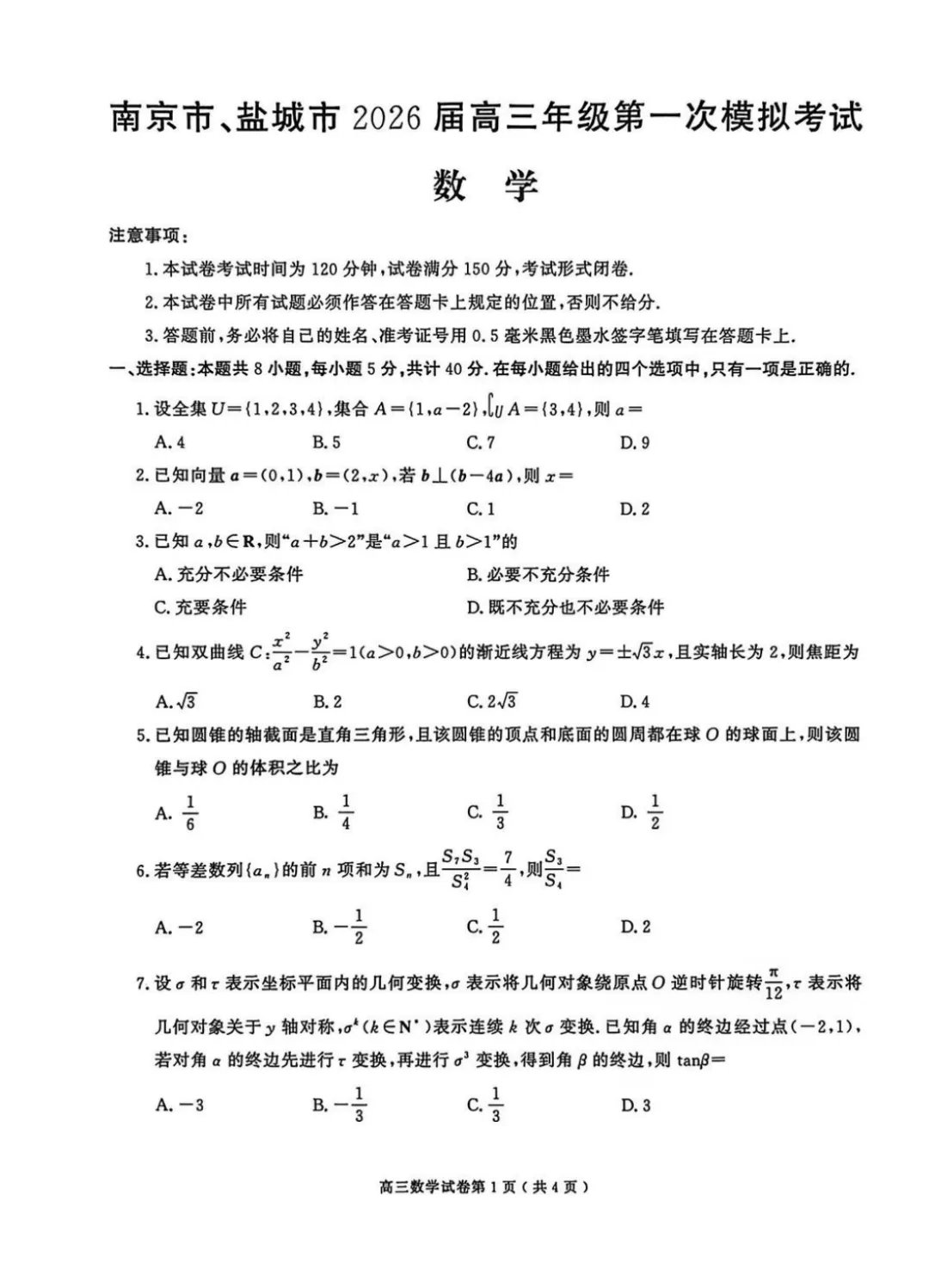 2026 届南京盐城市普通高中高三年级第一次模拟考试数学试卷及答案