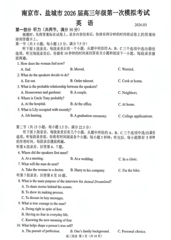 2026届江苏省南京市、盐城市高三一模英语卷(含答案).pdf