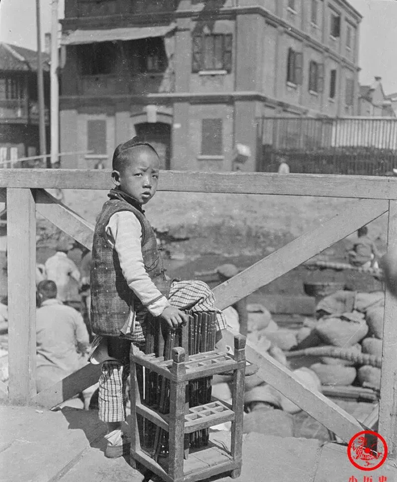 这个站在桥栏边的孩子,手上的叫木签,一大把排在木格里,看着不起眼,其实是那时的买卖工具,有人说小小年纪守着一摞签子,也是闯码头的起步活,碰上饭口时间,身后一大家子都盯着他,看他能不能换回点买米钱,照片里这孩子神情有点拘,这份儿味儿,南京的老人一看都懂。