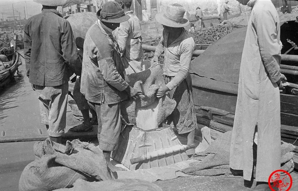 这个场景是南京老码头的粮食交易,水边一船挨着一船,麻袋铺地,大小伙围着斗米秤,衣服旧,神气足,这一圈吆喝声、泼水声夹杂着粮食掉落的响,路过的小孩都会放慢脚步多看两眼,这东西,见的人不少,细节还都能说出来,现在买米走进超市,哪个还晓得麻袋肩膀挑着有多重。