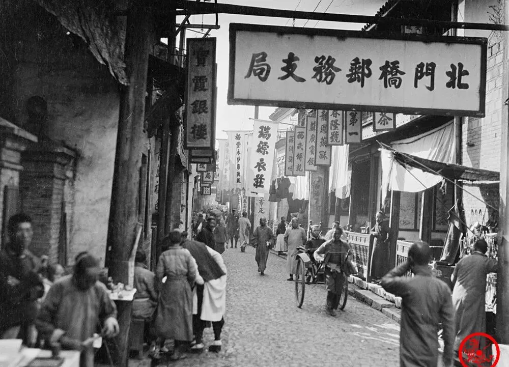 这段砖路是北门桥街区,匾额、招牌、板棚又高又密,一家铺子挨着一家,脚下咯噔响就是这条街的节奏,过去这里下关、鱼市、估衣铺热闹得很,来往的人推着货、吆喝生意,有次跟着家里人逛到这边,奶奶习惯看看裁缝铺,我则凑到糖果摊,嘴馋还得眨着眼装成熟。