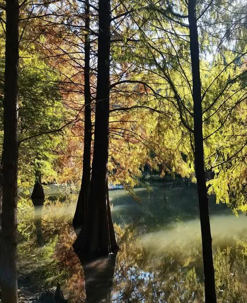 构图上别老想着把整棵树拍全,落羽杉最美的其实是局部,树干的纹理、叶子的层次、水面的倒影,这些细节比全景更耐看,你可以试试用树干做前景,让后面的颜色虚化掉,或者拍一片落叶浮在水面上,旁边是树的倒影,这种小景往往比大场面更有意思。