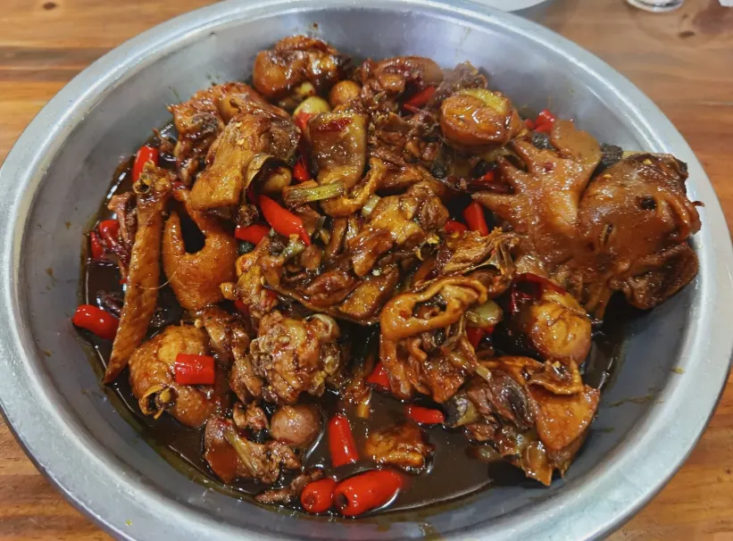 如果只挑一道说做法,我会选老公鸡。鸡块先下锅煸出香气,再放姜、蒜、酱油慢炖,火不能急。炖到肉收紧,汤汁发亮,再丢一把青椒。吃的不是嫩,是那股越嚼越香的韧劲。