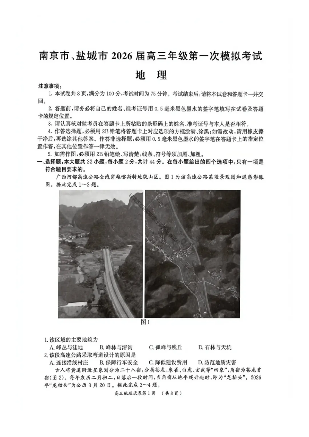 【地理】南京市、盐城市2026届高三年级第一次模拟考试试题+答案