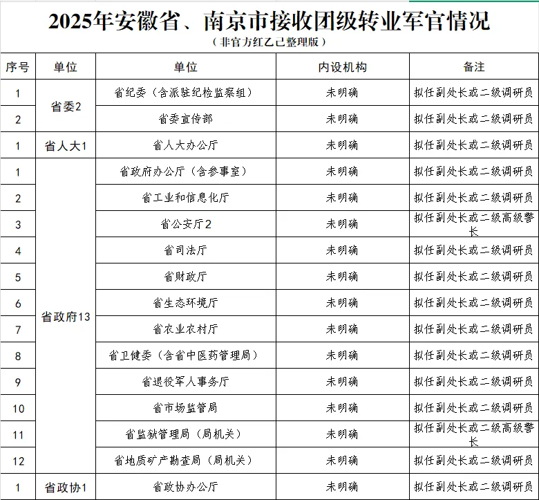 从安置岗位数量上看,安徽19个,南京39个,一个省还干不过一个市。南京市提供的正团职安置岗位明显多于安徽省直机关。