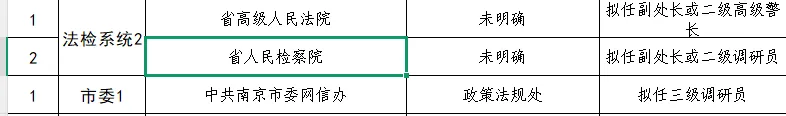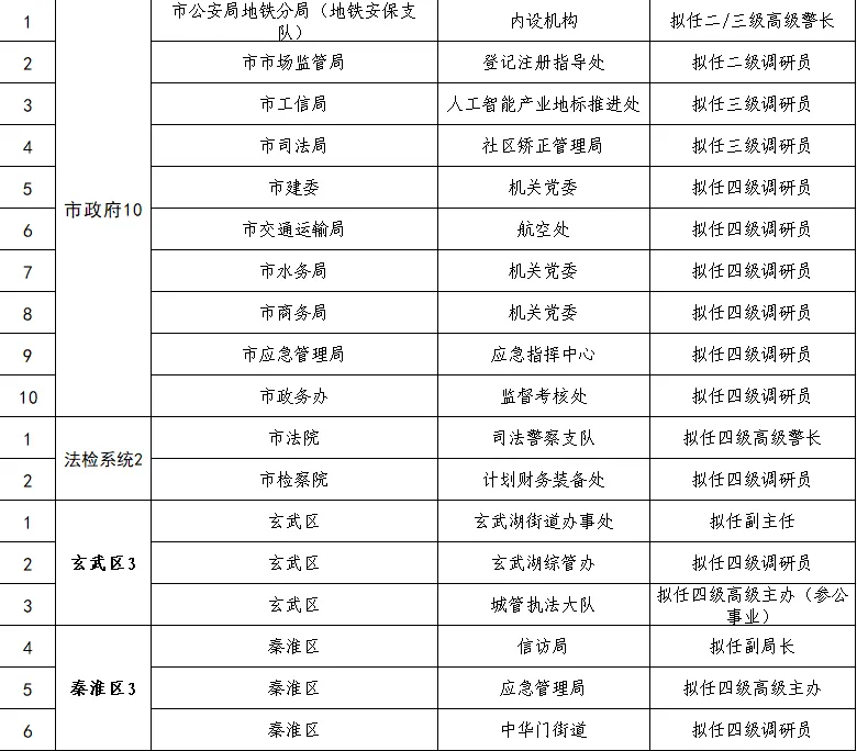 南京市提供39个岗位,涵盖市直机关与区直(街道)岗位,但定级情况呈现较大落差。仅5人定为二级调研员(其中3人均在街道),24人定为四级调研员(高级警长、高级主办),4人为三级调研员(高级警长、高级主办),另有6人定为正科实职(副主任、副局长、副主席),实职普遍降低两职,职级普遍下调两级。