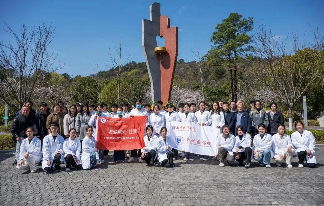 在2026年清明节来临之际,一场神圣而庄严的追思活动如约而至。3月27日,由南京市红十字会组织的“捐友”感恩悼念活动,在“南京市遗体器官捐献者纪念林”隆重举行。今年的活动主题为《沐手敬书,生命的淡香》。南京医科大学基础医学院党委副书记、副院长段振东,教务处副处长、人体解剖学系主任张永杰带领学院人体解剖学系教师及本科生、研究生代表参加了本次缅怀活动。