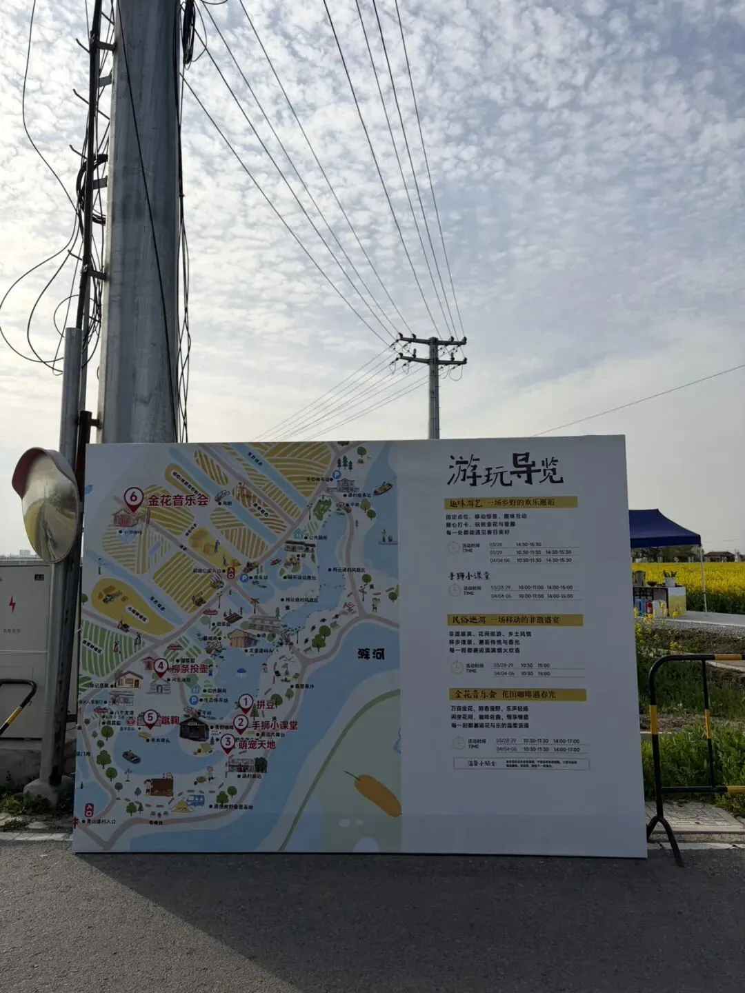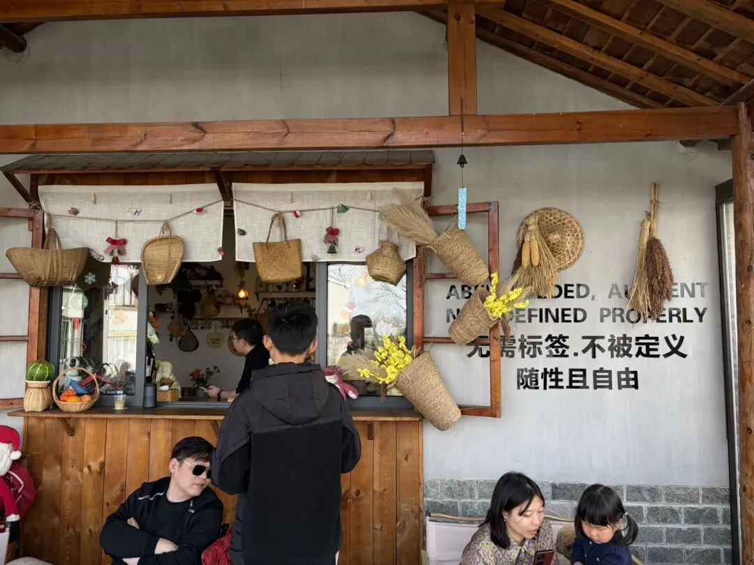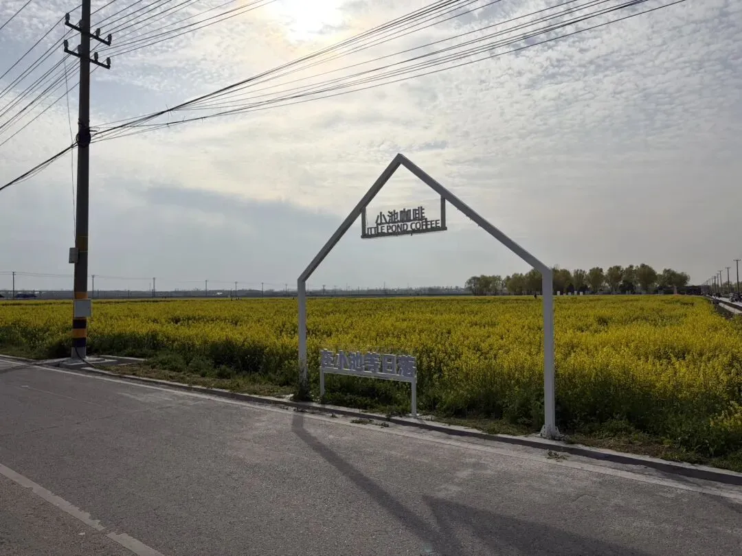 进入村子内,有许多指示宣传牌,商业化打造复古的村落,看着还不错,适合打卡拍照!走累了,可以去咖啡店,买杯咖啡。这次去的咖啡店是青野咖啡,点了阿芙加朵,价格36,比较贵,味道还不错!咖啡馆位置较高,可以远瞰村子里的河塘和油菜花田,适合歇脚聊天!村子里有几块比较大的水潭。靠近大路旁边的这块水塘,风景惬意,适合露营,亲子玩耍!大概下午3点多到的,没打算吃饭,所以没有特别关注吃饭地方。渔村面馆据说还不错,目前还没尝试过!此外,村落中还看到有海底捞的宣传旗,不知道有没有正式营业!