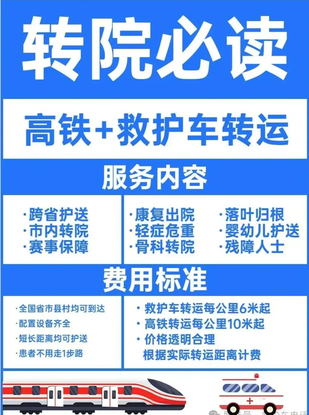 【核心服务】✅ 危重患者长途转运✅ 跨省医疗护送✅ 新生儿专业转运✅ 术后康复转院✅ 异地就医接送✅飞机高铁转运
