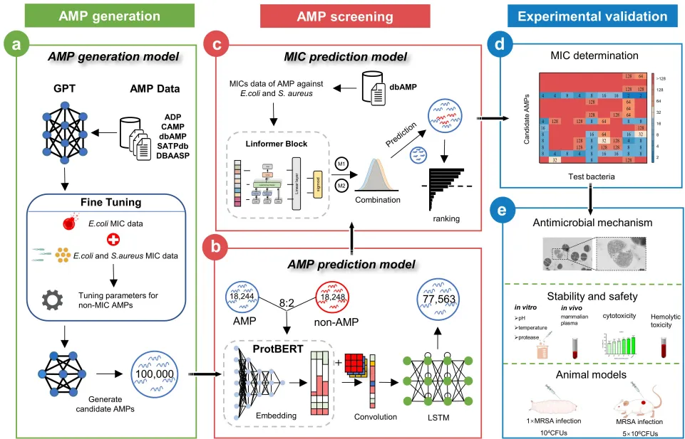 “如果让AI学习数万首古诗,它能写出李白级别的诗句吗?”南京农业大学团队用同样的思路训练了BroadAMP-GPT。研究团队从五大数据库(如dbAMP、APD)收集了2.6万条天然AMP序列作为“诗歌库”,先用GPT模型进行预训练,再针对大肠杆菌和金黄色葡萄球菌的MIC数据微调,使AI学会“押韵”——即生成兼具阳离子电荷和两亲性的肽结构。生成的10万条序列中,AI通过两级筛选锁定了110个候选肽:第一级用AMP预测模型(准确率超90%)剔除无效序列,第二级用Linformer模型预测MIC值,确保肽能同时对抗革兰氏阴性和阳性菌。令人惊叹的是,AI生成的肽不仅保留了天然AMP的膜靶向特性,还通过富集赖氨酸(Lys)和丙氨酸(Ala)增强了正电荷和疏水性,犹如给武器镀上“破甲涂层”。