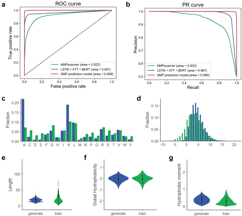 图2. 生成肽序列的AMP预测模型性能及理化特性。(a) 不同AMP预测模型的AUROC值。(b) 不同AMP预测模型的AUPRC值。(c-g) 生成序列与训练序列在氨基酸组成、电荷、长度、整体疏水性及疏水矩等属性上的分布情况。