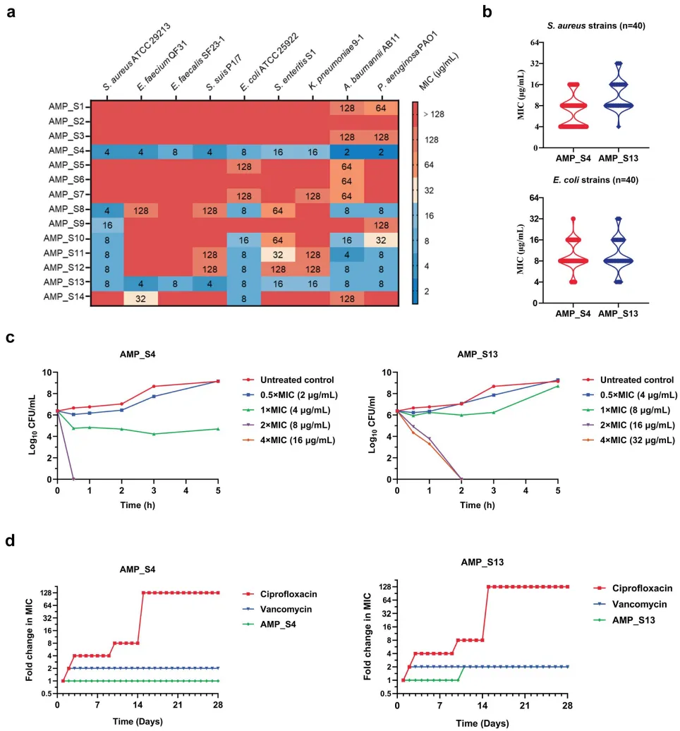 图3. 候选抗菌肽的抗菌活性与耐药性诱导实验。(a) AMP_S4与AMP_S13对不同菌种的抑菌浓度。(b) AMP_S4与AMP_S13对金黄色葡萄球菌(n=40)和大肠杆菌(n=40)的抑菌浓度。(c) AMP_S4与AMP_S13对金黄色葡萄球菌ATCC 29213的杀菌动力学曲线。(d) 在亚抑菌浓度(1/2x)的环丙沙星、万古霉素、AMP_S4及AMP_S13作用下,金黄色葡萄球菌ATCC 29213的耐药性诱导研究。