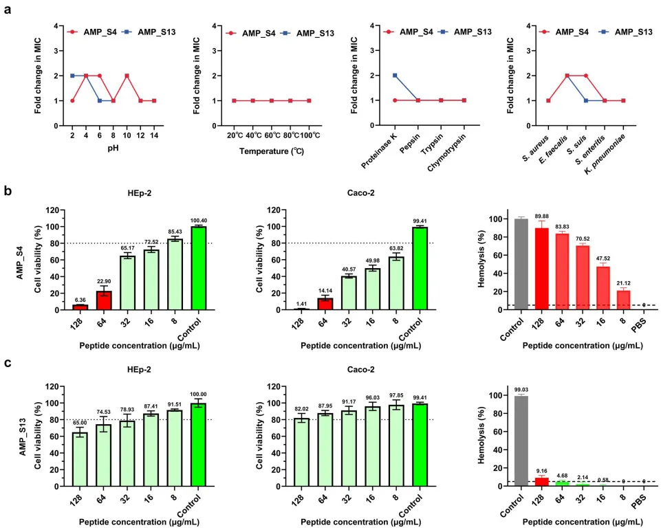 图4. AMP_S4与AMP_S13的稳定性与毒性分析。(a) pH值、温度、蛋白酶及血浆对AMP_S4与AMP_S13抗菌活性的影响分析。多肽在不同条件下孵育1小时后测定其最小抑菌浓度。AMP_S4(b)与AMP_S13(c)对HEp-2细胞、Caco-2细胞的细胞毒性及小鼠红细胞的溶血毒性。