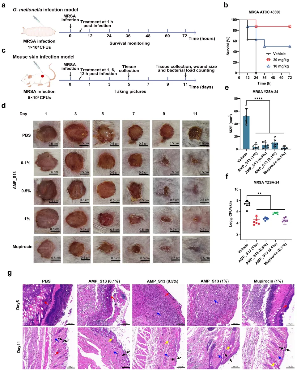 图5. AMP_S13在大蜡螟幼虫感染模型及皮肤伤口感染模型中的体内抗菌效果。(a)动物试验中采用的MRSA感染大蜡螟模型示意图。(b)研究中72小时内,经AMP处理的MRSA感染大蜡螟的存活率。(c)动物试验中采用的小鼠皮肤感染模型示意图。(d)不同处理后第1、3、5、7、9及11天皮肤伤口的典型照片。(e)11天后皮肤伤口的大小及(F)皮肤伤口的细菌载量。(g)不同处理组MRSA感染皮肤组织的苏木精-伊红(H&E)染色组织学分析。