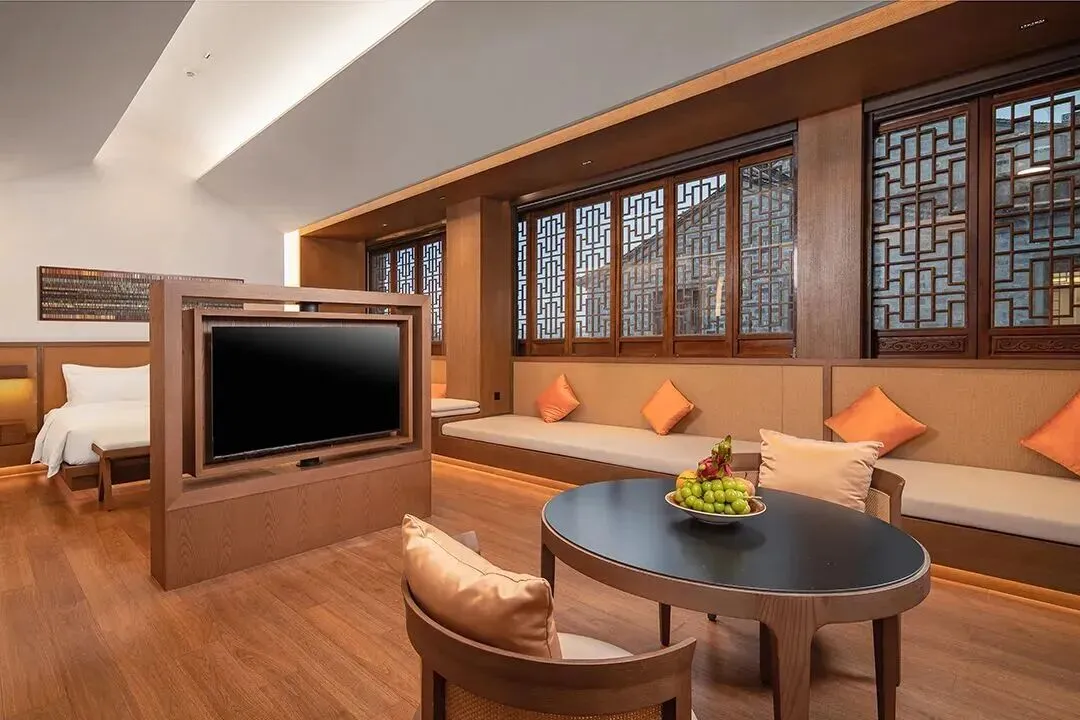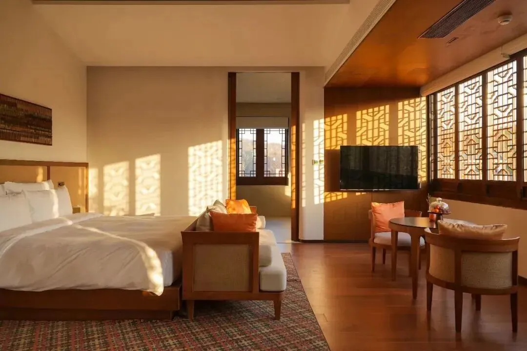 客房内部,简约的线条搭配藤编与棉麻,保留了木石的原始质感。当阳光透过雕花木窗洒在床榻,这一刻,所有的繁杂都被抽离,只余安宁。