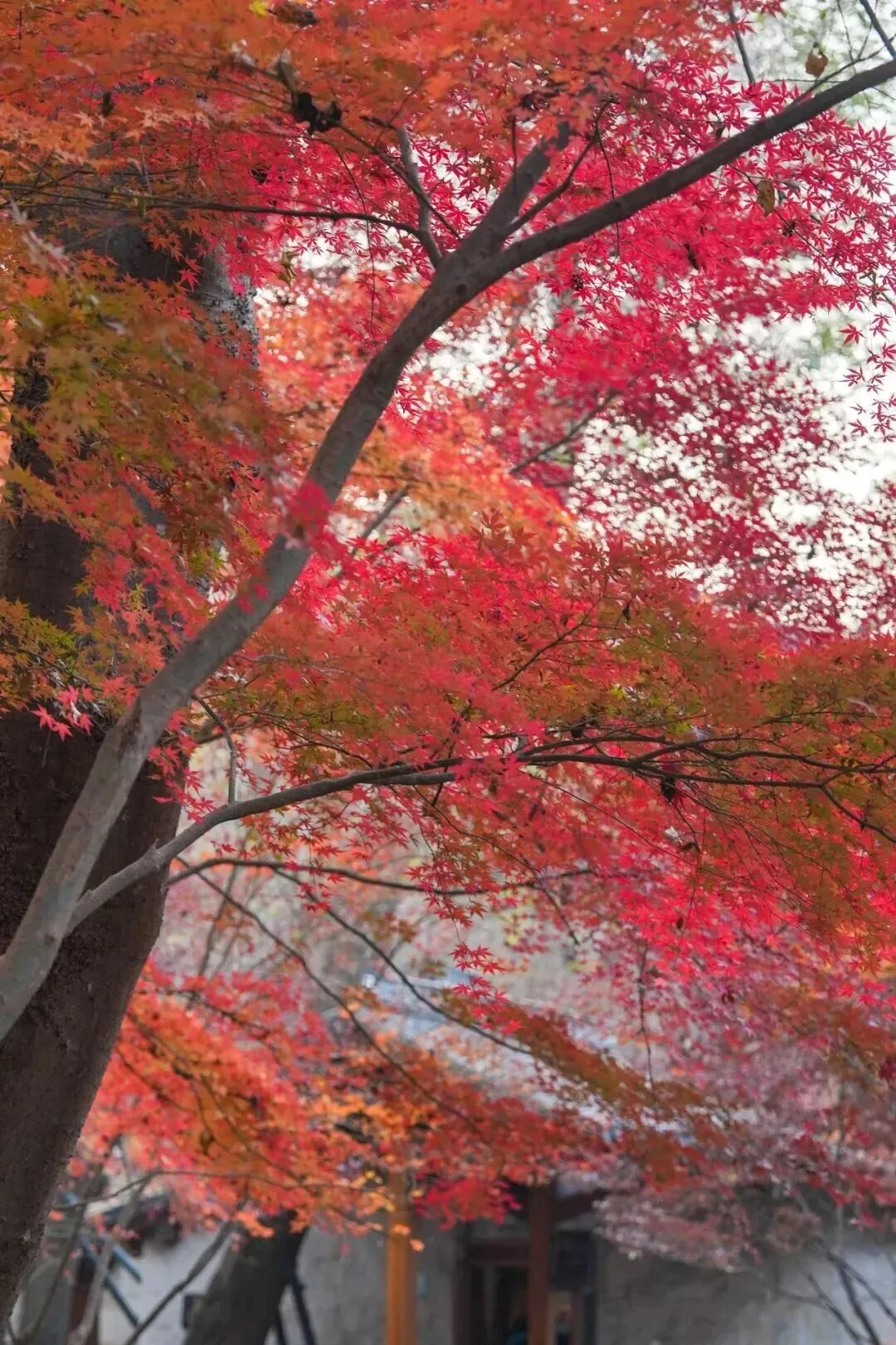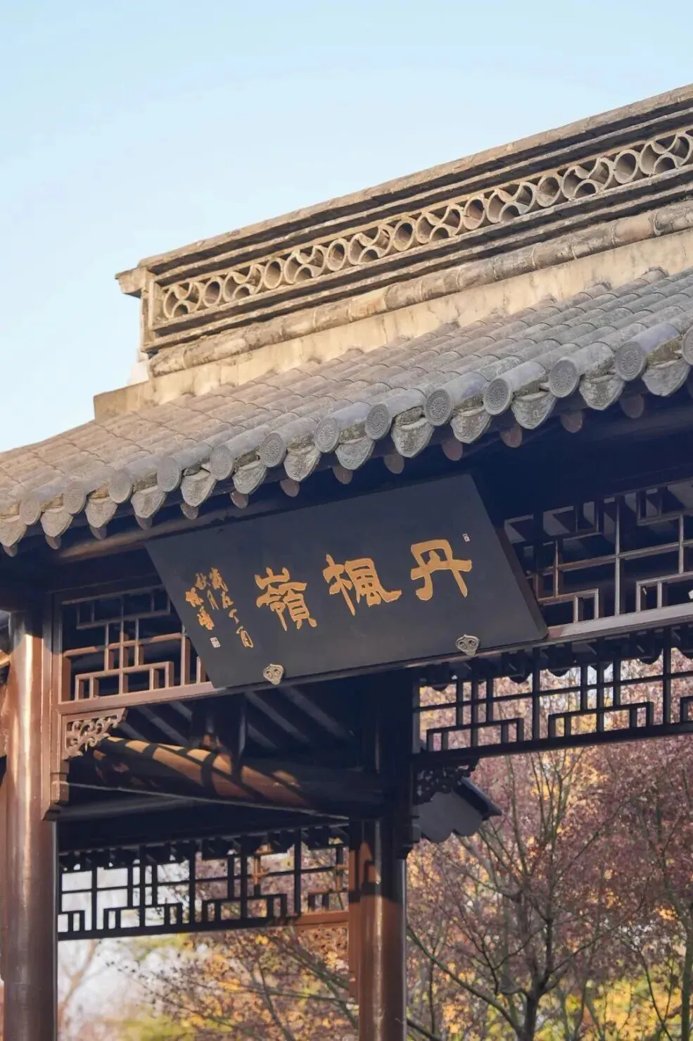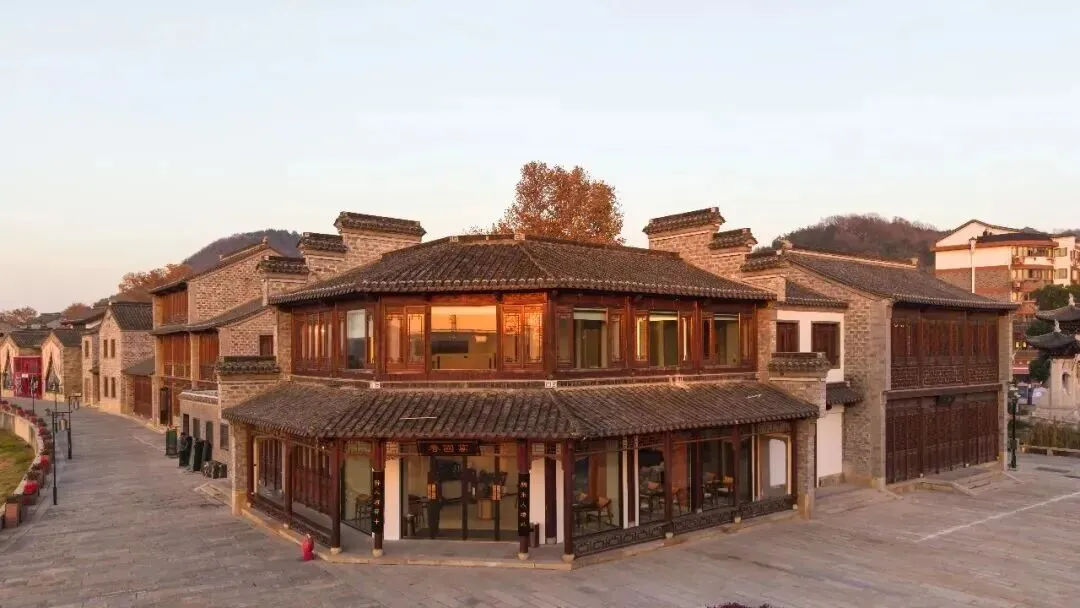 灰瓦木窗、檐角起翘,灰白色的江南建筑与山麓的枫影层叠相映。步入其中,一种宁静淡雅的氛围扑面而来,让人瞬间忘却尘世喧嚣。