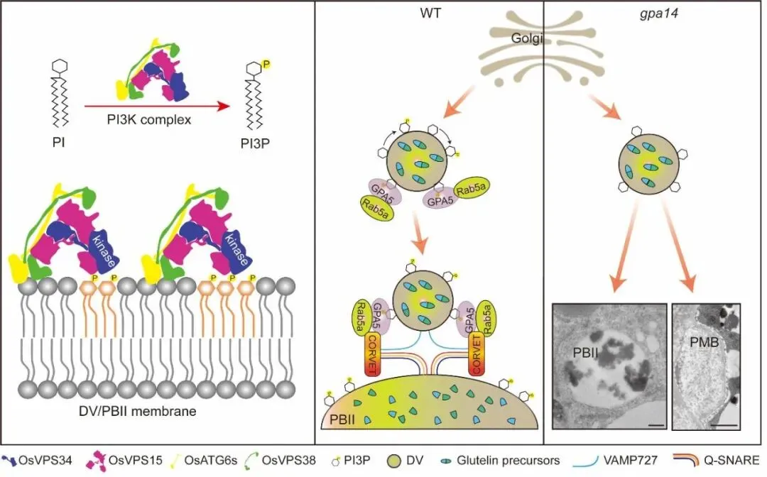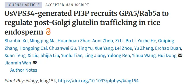 近日,南京农业大学与中国农科院作物科学研究所的万建民院士、董慧教授及王益华教授团队合作,在国际植物学权威期刊《Plant Physiology》上发表了突破性研究成果。该研究利用筛选到的谷蛋白前体积累弱突变体gpa14,结合图位克隆、脂质组学及细胞生物学等多维度技术手段,首次阐明了磷脂酰肌醇3-磷酸(PI3P)在谷蛋白转运中的核心作用,揭示了OsVPS34介导的PI3P合成如何通过招募调控因子GPA5/Rab5a,促进致密囊泡与蛋白储存液泡的融合,从而保障谷蛋白正确沉积的分子机制。