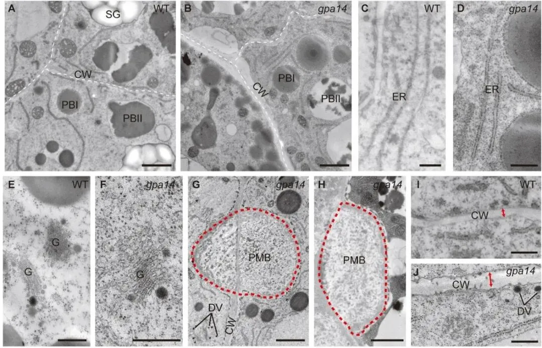 研究团队首先从粳稻品种宁粳4号的突变体库中筛选获得了gpa14突变体。该突变体表现出显著的粉质皱缩表型,扫描电镜观察显示其胚乳淀粉颗粒呈球形且排列松散。生化分析表明,突变体中57 kDa的谷蛋白前体大量积累,而成熟的谷蛋白亚基及α-球蛋白含量显著降低。值得注意的是,内质网分子伴侣的含量在突变体与野生型中无显著差异,这排除了内质网输出缺陷的可能性,暗示问题出在高尔基体后的转运环节。细胞学观察进一步证实了这一推断:在野生型中,谷蛋白与α-球蛋白共同定位于蛋白储存液泡II中;而在gpa14突变体中,部分蛋白被错误分选至胞外形成副壁体结构,且蛋白储存液泡II的体积显著缩小。透射电镜结果显示,突变体中高尔基体出芽形成的致密囊泡无法正常转运,而是堆积在细胞膜附近并被分泌到胞外。