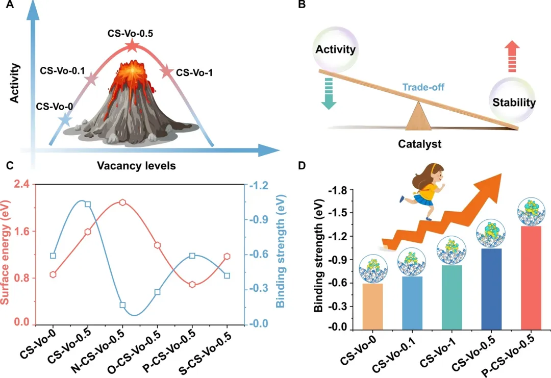 图1. A 空位水平与催化活性之间的关系;B 催化剂活性与稳定性之间的跷跷板关系;C N-CS-Vo-0.5、S-CS-Vo-0.5、O-CS-Vo-0.5、P-CS-Vo-0.5对Li₂S₄的结合强度计算值及表面能;D 催化剂上Li₂S₄的吸附能及差分电荷密度。