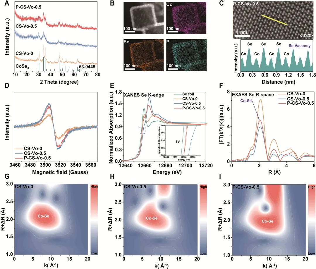 为更深入探究Se原子的局部结构,采集了X射线吸收近边结构谱(XANES)和扩展X射线吸收精细结构谱(EXAFS)。图2E展示了CS-Vo-0、CS-Vo-0.5、P-CS-Vo-0.5及硒箔的Se K边XANES谱图。为进一步明晰样品的局部几何配位环境细节,获取了CS-Vo-0、CS-Vo-0.5、P-CS-Vo-0.5及硒箔的k³加权EXAFS振荡的傅里叶变换(FT-EXAFS)结果(图2F)。CS-Vo-0、CS-Vo-0.5和P-CS-Vo-0.5样品中,Co-Se键的中心峰均出现在约2.1 Å处。因此,借助小波变换(WT)EXAFS及等高线图,可进一步区分CS-Vo-0、CS-Vo-0.5和P-CS-Vo-0.5的结构无序性与电子结构(图2G-I)。小波变换分析显示最大强度与Co-Se键相关联。