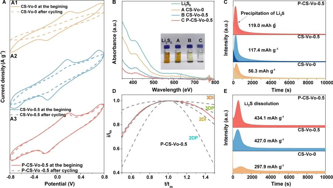 图3. A. 对称电池初始阶段与循环后的循环伏安(CV)曲线;B. Li₂S₆吸附实验照片及对应的紫外-可见(UV-Vis)光谱图;C. Li₂S成核过程;D. P-CS-Vo-0.5的无量纲瞬态曲线(对应成核过程);E. 不同催化剂作用下Li₂S的解离过程。