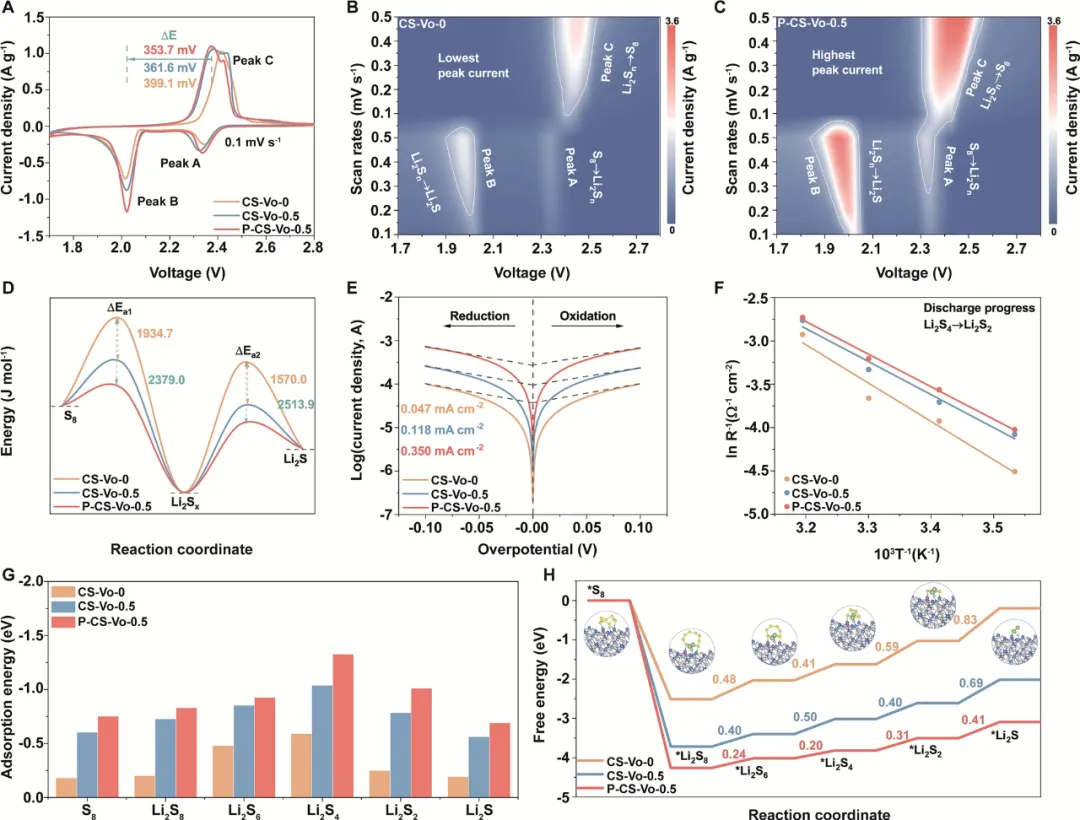 图4. A 循环伏安(CV)曲线;B CS-Vo-0和C P-CS-Vo-0.5在不同扫描速率下的CV图等高线图;D 两种硫正极的相对活化能;E 塔菲尔(Tafel)曲线;F 绝对温度(T)的倒数与电荷转移电阻倒数对数之间的线性关系;G 计算所得硫物种的吸附能,以及H相对自由能。