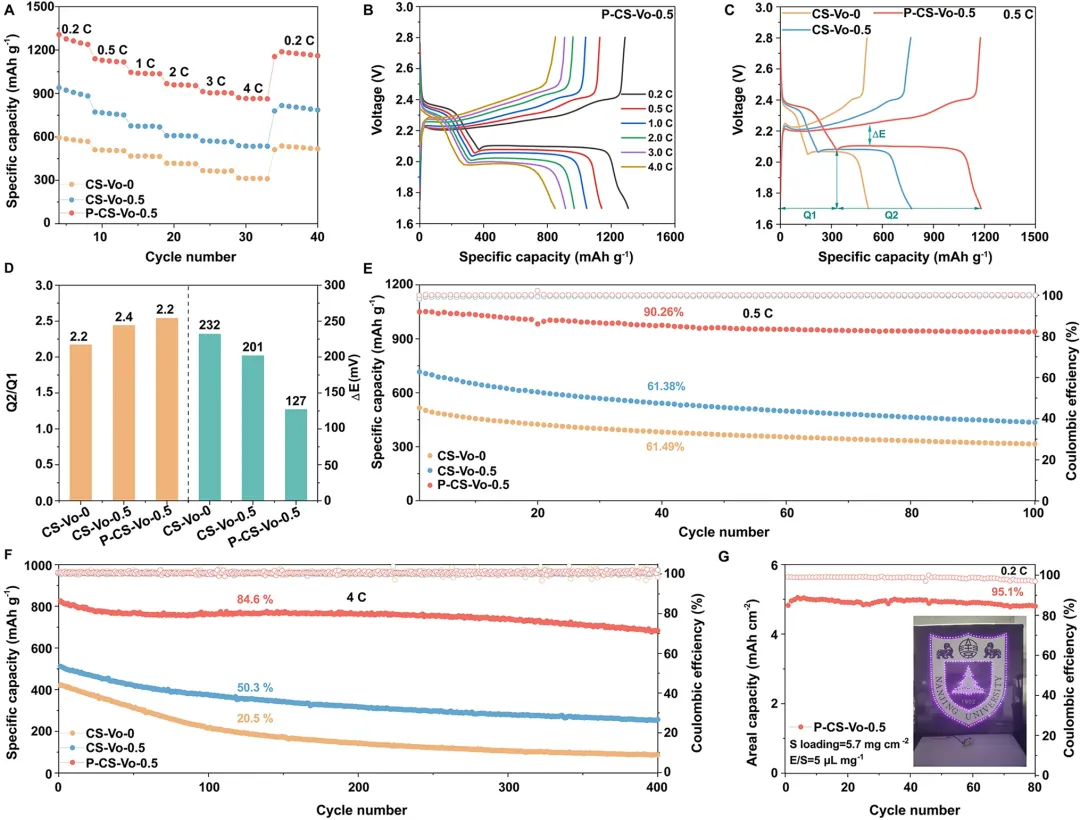 为进一步评估电化学性能,对电极的长期循环稳定性进行了测试。如图6E所示,在0.5C下循环100次后,采用P-CS-Vo-0.5隔膜的电池初始比容量为1041.1 mAh g⁻¹,容量保持率为90.26%,而CS-Vo-0.5(716.1 mAh g⁻¹,61.38%)和CS-Vo-0(516.0 mAh g⁻¹,61.49%)的容量保持率显著较低。在4C高倍率下,采用P-CS-Vo-0.5隔膜的电池在400次循环后容量保持率为84.6%,远优于CS-Vo-0.5和CS-Vo-0隔膜(容量保持率分别为50.3%和20.5%,如图6F所示)。在4C高倍率循环过程中,电池容量呈现非单调变化——先下降、后恢复、最终衰减,反映了电化学过程的阶段性特征。对硫负载量高达5.7 mg cm⁻²的电池进行了全面电化学评估(图6G),采用P-CS-Vo-0.5隔膜的电池面容量达5.04 mAh cm⁻²,80次循环后容量保持率为95.1%。
