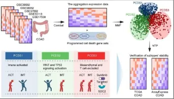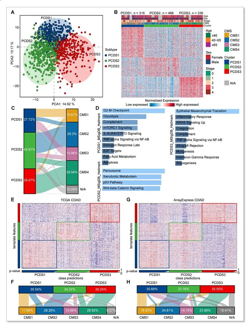 本研究基于 PCD 相关基因,采用 NMF 对 1140 例 COAD 患者分型,确定 3 种稳定的 PCDS 分子亚型,筛选出 303 个特征基因,功能富集显示各亚型分别关联不同通路,与 CMS 亚型存在一定重叠且 PCDS3 与 CMS4 高度重合,该分型在两个独立队列中验证均稳定可靠。