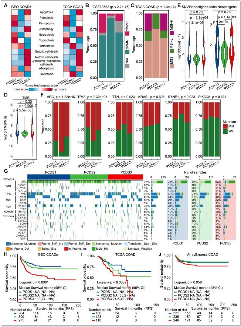 我们利用 TCGA COAD 突变数据,分析 PCDS 亚型与驱动基因突变的关联:PCDS1 和 PCDS3 的肿瘤突变负荷(TMB)及新抗原负荷显著高于 PCDS2;APC、TP53 等主要驱动基因在三种亚型中突变频率差异显著,PCDS2 的 APC 突变率高、TP53 突变率低且通路相关基因突变少;生存分析显示,PCDS3 亚型预后最差,且该结论在多个独立队列中得到验证。