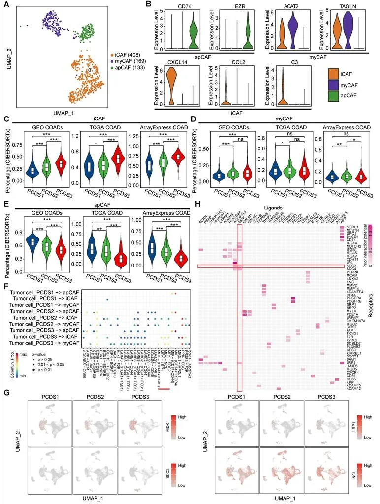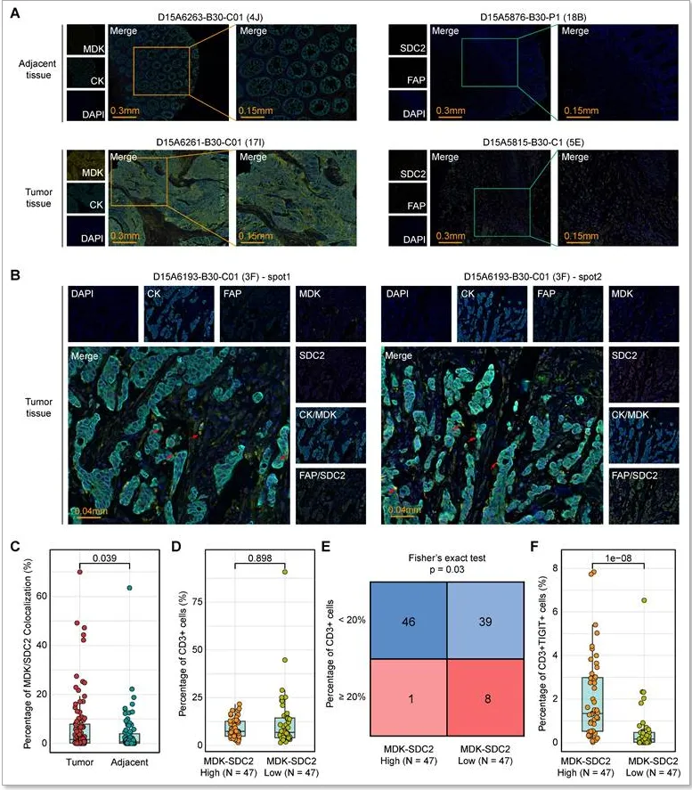 PCDS3 的成纤维细胞富集或介导复杂肿瘤 - 基质互作,本研究先通过 CopyKAT 识别恶性肿瘤细胞,将成纤维细胞注释为 myCAF、iCAF、apCAF 三亚群,再经 CIBERSORTx 发现 PCDS3 中 iCAF 浸润最高,PCDS1 中 apCAF 最丰富,myCAF 在三亚型中无显著差异。CellChat 和 NicheNet 分析证实,PCDS3 中肿瘤细胞与 iCAF/myCAF 通过MDK-SDC2 轴发生特异性相互作用,空间转录组数据显示二者表达共定位,且高表达组 T 细胞功能障碍和排除评分更高。mIF 染色进一步验证 MDK-SDC2 在肿瘤组织中空间共定位显著高于癌旁组织,高共定位组高 CD3⁺T 细胞浸润占比低、TIGIT⁺耗竭 T 细胞比例高,证实该轴介导的肿瘤 - 成纤维细胞互作与 T 细胞功能障碍及排除密切相关。