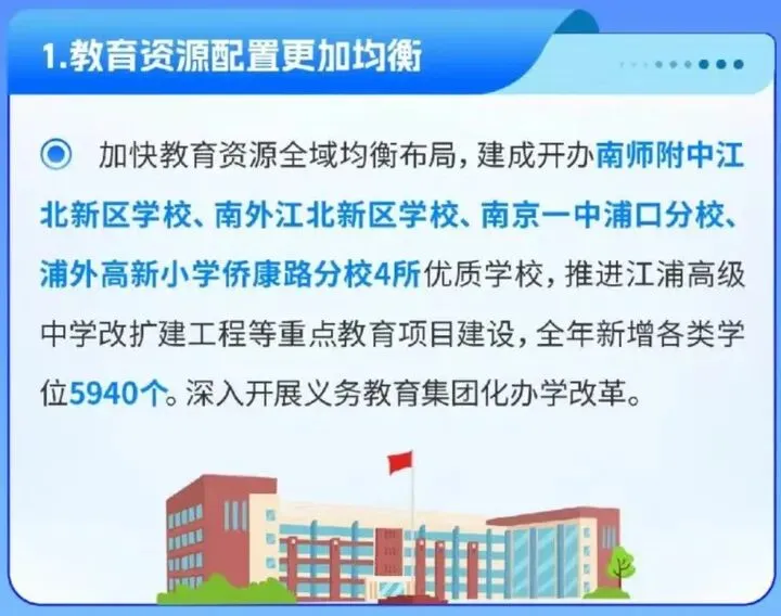 会上发布的《南京江北新区教育强区建设2026年工作要点》中提及,要建成开办4所学校——南师附中江北新区学校、南外江北新区学校、南京一中浦口分校、浦外高新小学侨康路分校。
