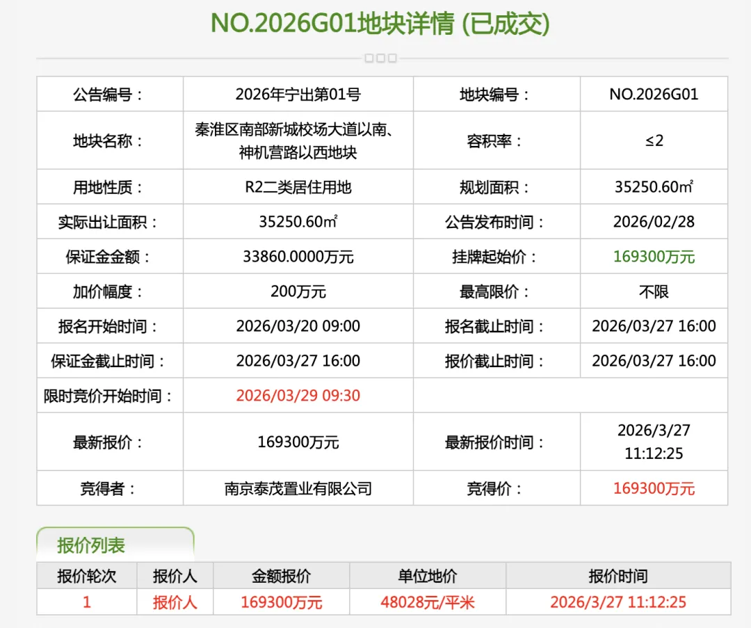 6、溧水G01地块,底价成交,拿地房企为南京大成房地产开发有限公司,成交总价2亿元,成交楼面价5659元/㎡。
