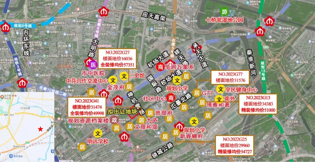 距离市不动产档案馆新馆、地铁10号线和在建地铁6号线换乘站机场跑道旧址站不足300米,距离南外明远中小学、市第一幼儿园国际部不足400米,距离中芬合作交流中心、丽笙酒店、在建国际路社区中心、在建佳营路社区中心、中国第二历史档案馆新馆等直线不足500米,距离预计今年开业的金陵万象城直线不足600米,距离市中医院、地铁5号线和10号线换乘站大校场站直线不足800米,距离南京首家京东MALL直线约1.3公里。