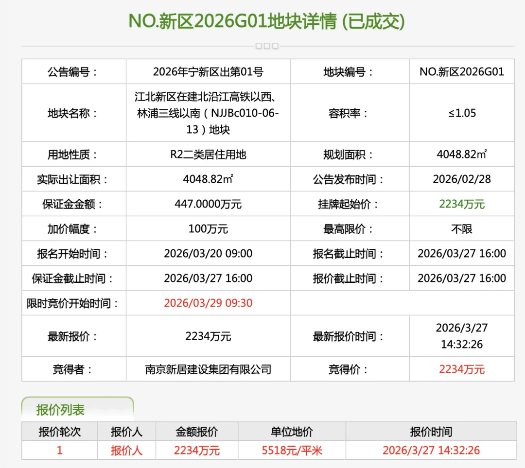 4、江北核心区G01地块,底价成交,拿地房企为南京新居建设集团有限公司,成交总价0.2234亿元,成交楼面价5005元/㎡。
