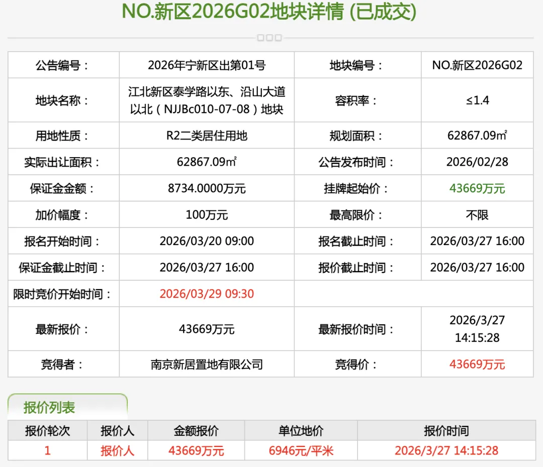 5、江北核心区G02地块,底价成交,拿地房企为南京新居置地有限公司,成交总价4.3669亿元,成交楼面价4962元/㎡。