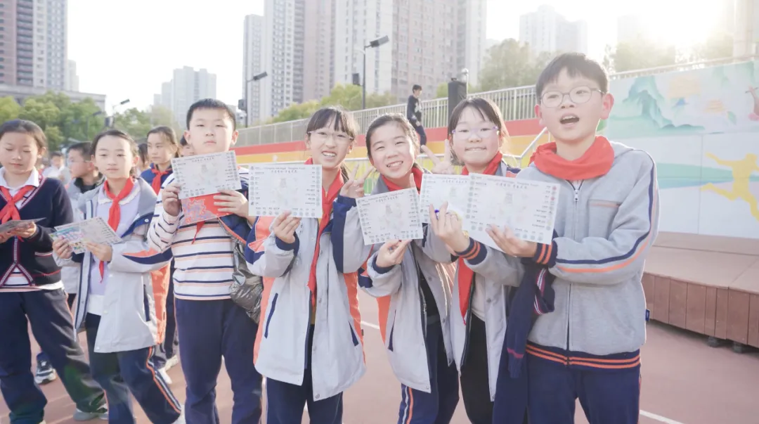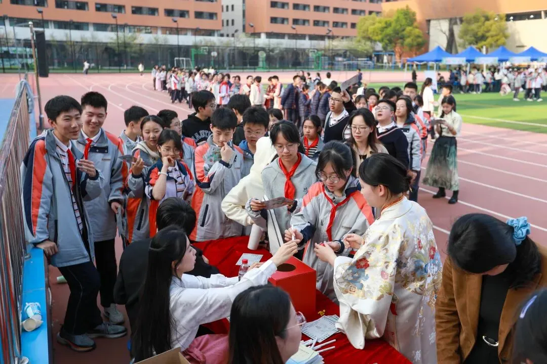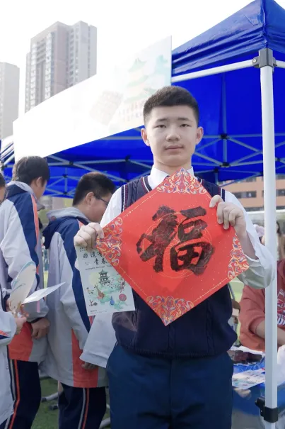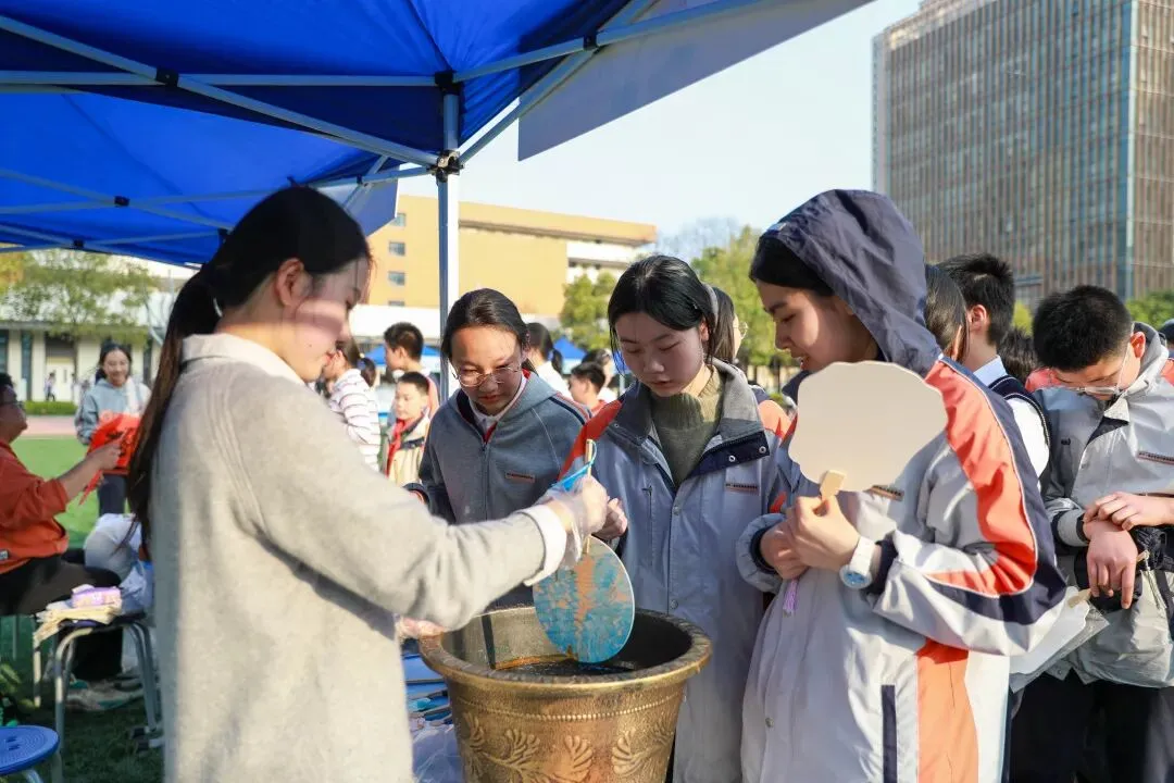 为了让每一个参与者都能全身心投入这场文化之旅,学校还特别设计了趣味满满的游园券闯关机制。自由体验的过程中,同学们每按要求完成一项展台体验,就能获得一枚专属贴纸,集满10枚贴纸,便可前往主席台抽取惊喜纪念品。这一小小的设计,彻底点燃了同学们的参与热情,让原本的“围观式打卡”,变成了全情投入的“沉浸式体验”。大家在玩乐间就完成了非遗文化的学习,以及英语听说能力的实战训练,让非遗变得更年轻、更有趣、更有生命力。