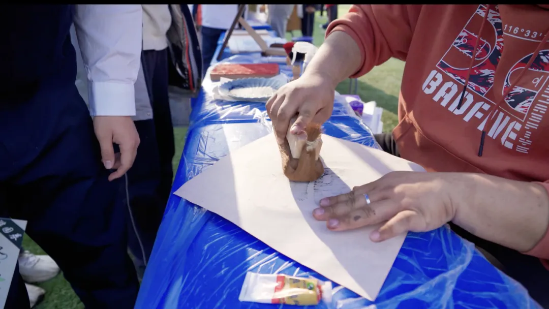 除了河外学子自主打造的展台,来自莫愁中等职业技术学校的哥哥姐姐们,也携漆扇与雕版印刷两大非遗项目展台来到现场,为同学们解锁了不一样的非遗体验。两个展台前都排起了长长的队伍,河外学子在哥哥姐姐的手把手指导下,亲手拓印下属于自己的雕版作品,领略漆扇创作的独特魅力,真切读懂了非遗技艺背后的千年传承。