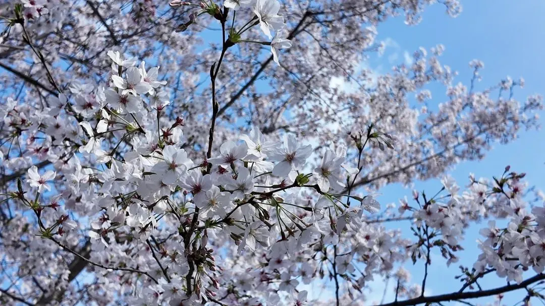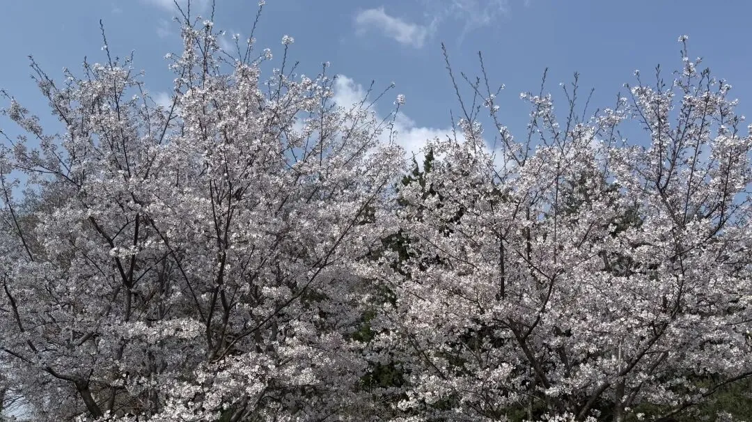 在淡蓝色天幕之下,粉白的花瓣令人沉醉。春晓深觉,这样的画面一瞬就注入心田。