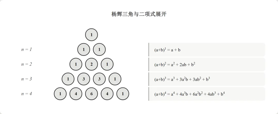 - 系数:杨辉三角与 对应的那一行,从左到右就是 展开各项的系数。