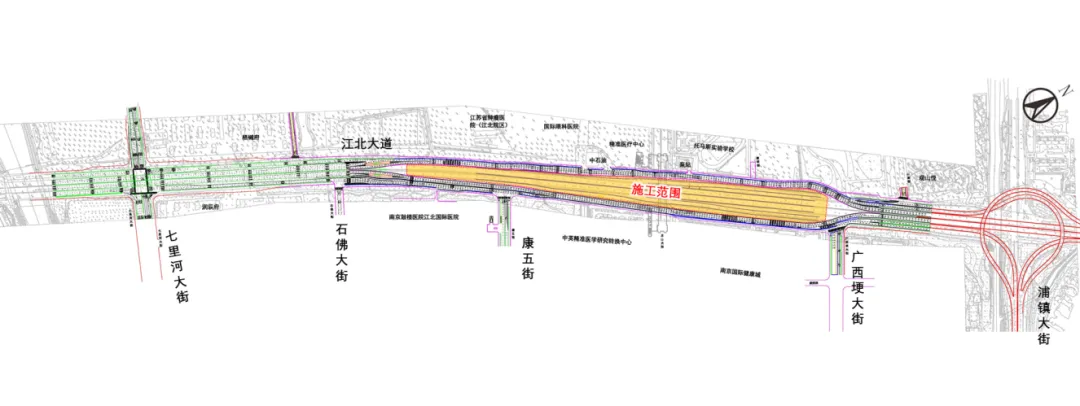 此次施工项目为328国道南京江北新区顶山互通至七里河大街段建设工程。项目主线设置隧道1座,长840米,按一级公路标准建设,以提升江北大道东、西两侧地块出行效率;主路为双向六车道,设计速度80公里/小时;辅路为双向六车道,设计速度40公里/小时。