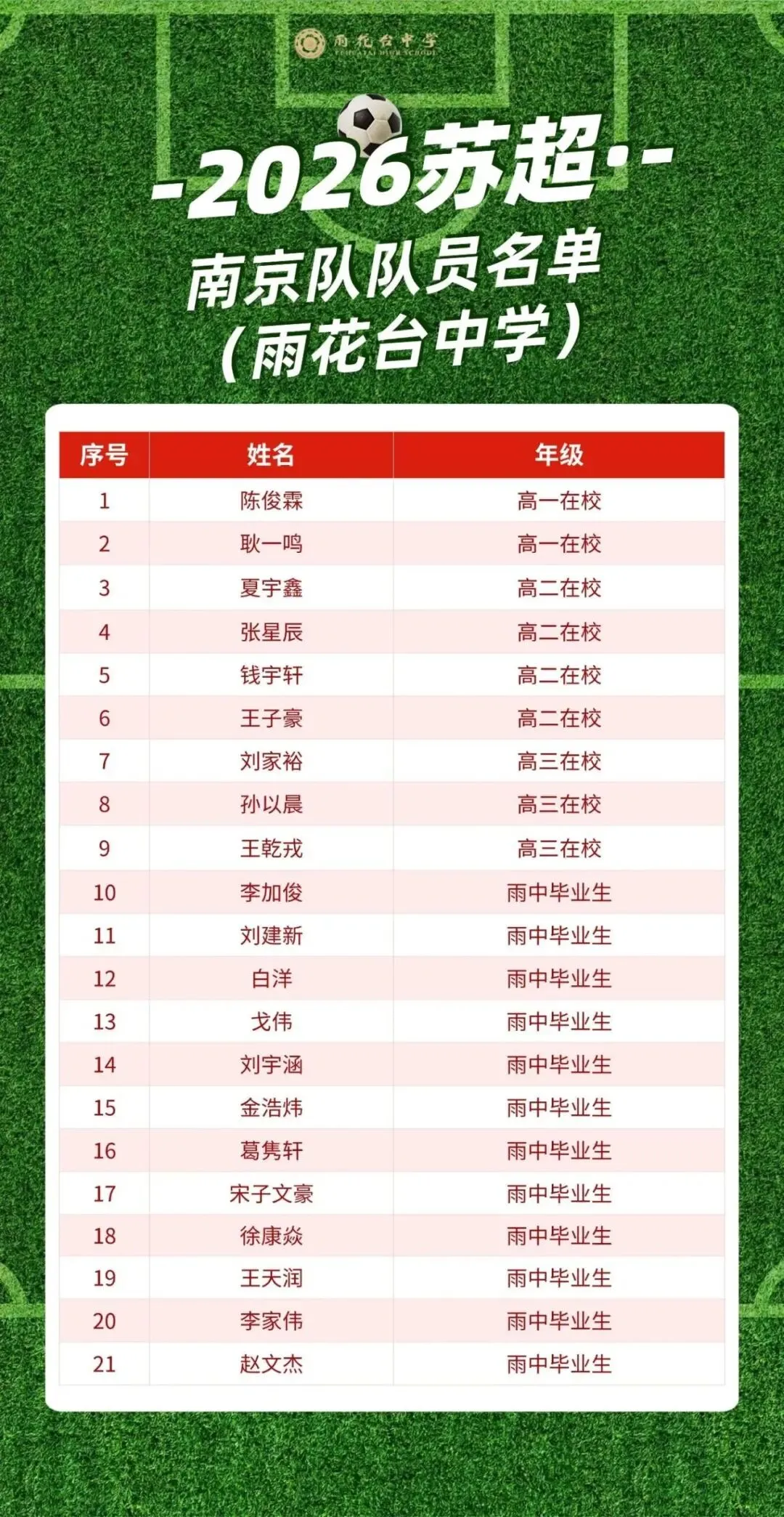 在这份星光熠熠的名单中,南京市雨花台中学共有21名优秀学子成功入选,入选人数再创新高。更令人惊叹的是,其中不仅有往届的毕业生,雨花台中学更有9名在校学生脱颖而出,用青春实力诠释着“雨中足球”的硬核底气,成为南京队阵容中不可或缺的青春力量。