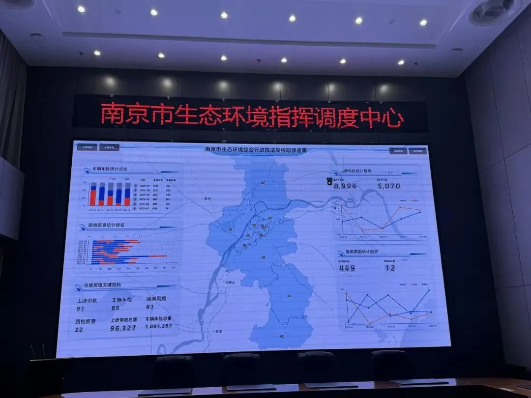 走进南京市生态环境综合行政执法局,显示屏上全市排放检验机构的实时数据、重型柴油车的远程在线监控信息正在不间断跳动。