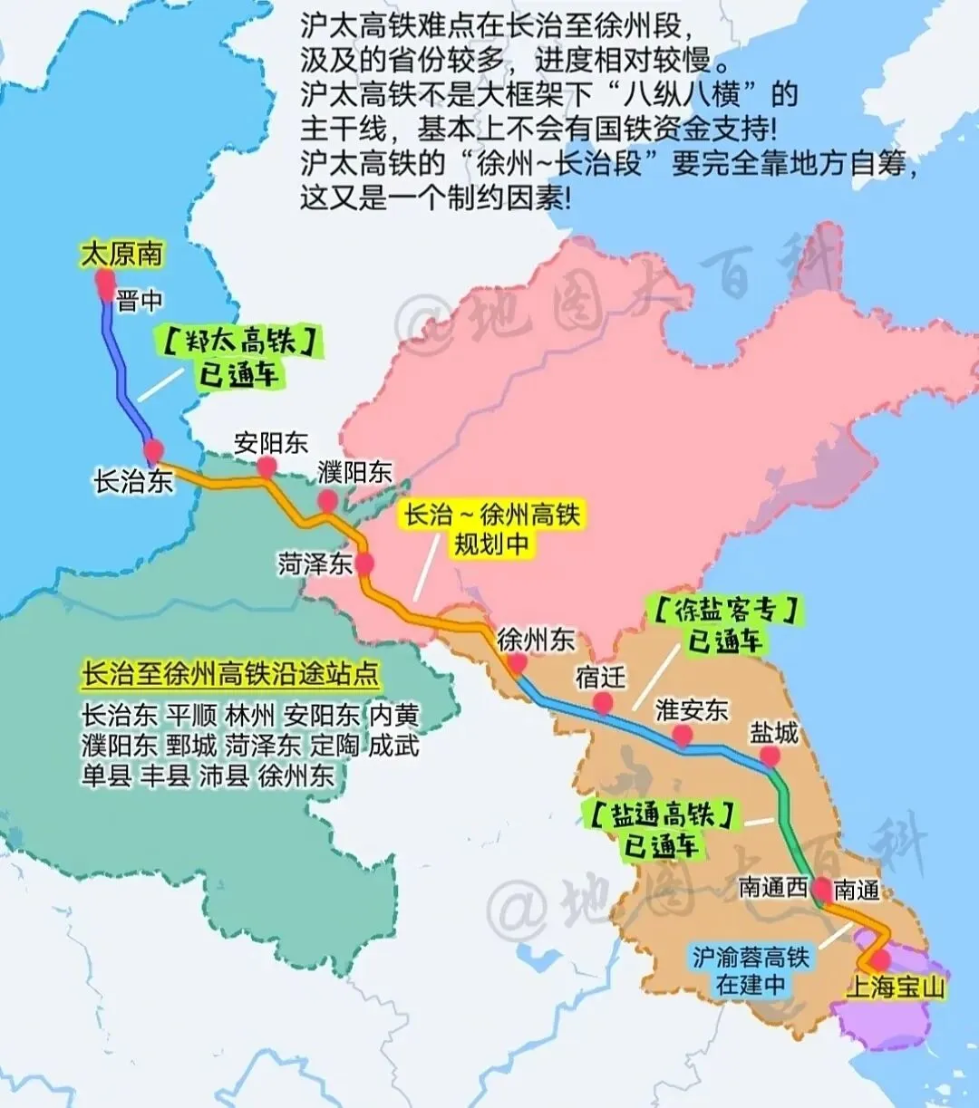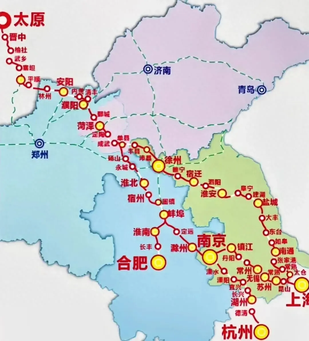 主要经过上海、江苏、山东、河南和山西5个省市,在连接长三角与晋东南、豫北以及鲁西南之间起到重要作用的一条高铁线路。