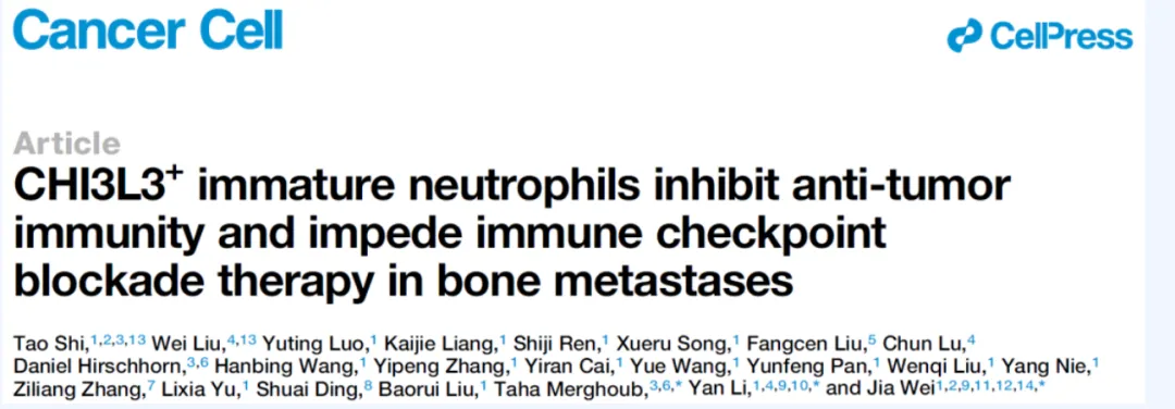 [1] Shi T, Liu W, Luo Y, et al. CHI3L3+ immature neutrophils inhibit anti-tumor immunity and impede immune checkpoint blockade therapy in bone metastases. Cancer Cell. 2025;43(10):1937-1957.e11.