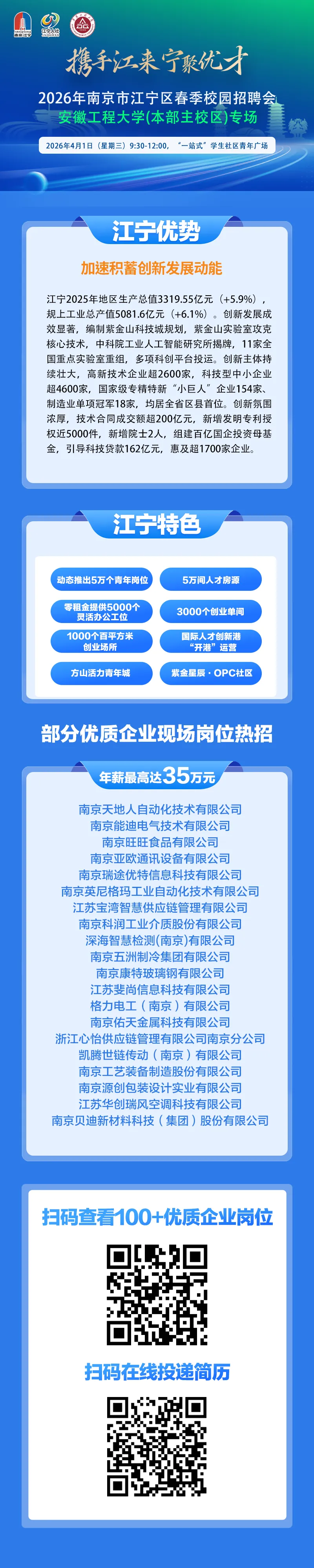 携手江来 宁聚优才 | 2026年南京市江宁区春季校园招聘会安徽工程大学(本部主校区)专场