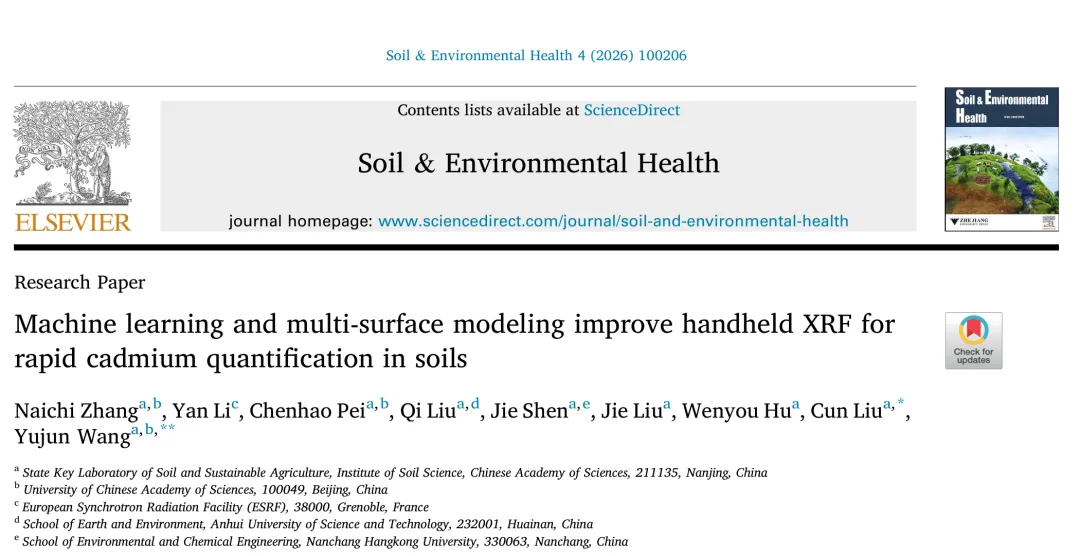 中国科学院南京土壤研究所王玉军团队在Soil & Environmental Health(SEH,《土壤与环境健康》)期刊发表题为“基于机器学习与多表面建模增强手持式XRF实现土壤镉快速定量(Machine learning and multi-surface modeling improve handheld XRF for rapid cadmium quantification in soils;2026,4(2): 100206)”的研究。