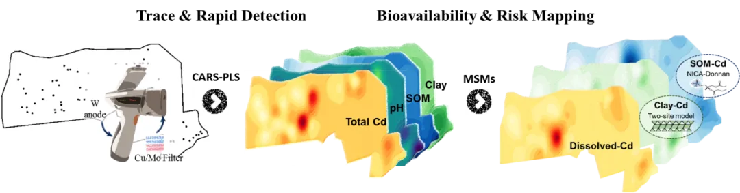 镉(Cd)因其高毒性和生物蓄积性,对生态系统和人类健康构成严重威胁。全球范围内,Cd的监管限值通常低至0.1~0.6mg/ kg,比其他重金属低1~2个数量级,这对快速、可靠的痕量检测提出了挑战。为了克服这一限制,本研究开发了一个基于手持式能量色散X射线荧光(HXRF)的增强框架,结合机器学习(ML)与多表面模型(MSMs),用于实现高效的土壤性质预测、Cd痕量检测和形态分析。这项概念验证性研究表明,该框架具备支撑现场原位监测的潜力,并可为更广泛地理与土壤背景下的修复优先级评估提供依据。