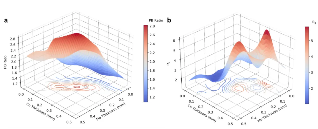 图1 不同Cu/Mo厚度组合下GSD23在Cd-Kα处的(a)峰背比与(b)Ra值